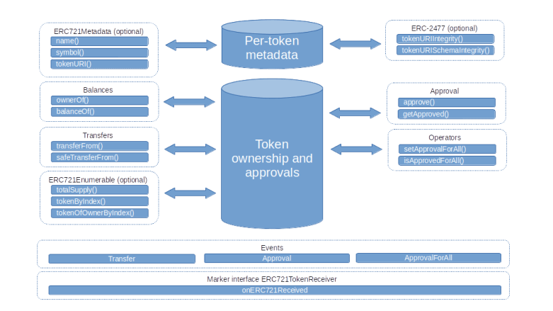 Similar to the ERC-20 standard, the community has developed a standard – the ERC-721 standard – for smart contracts representing NFTs. However, the ERC-721 standard is considerably more complicated than the ERC-20 standard. Here is an overview of its methods and events.