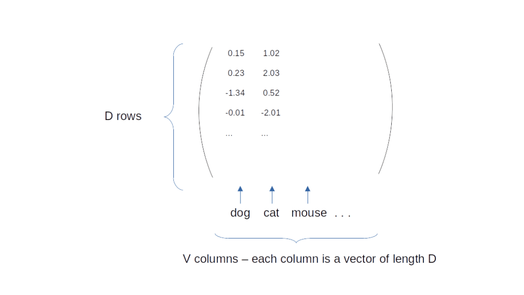 Most machine learning models which are used for natural language processing have a property called the model dimension which we will abbreviate by D. A model dimension of, say, 768, simply means that internally, all words are represented by vectors in a vector space of dimension 768. Thus, a single word is a one-dimensional tensor of length D = 768. Our task is therefore to assign to each word in a vocabulary of size V a vector in a D-dimensional space. This assignment, called the embedding, can be nicely represented as a matrix of dimension D x V, so that the column at position i represents the word with index i in the vocabulary.