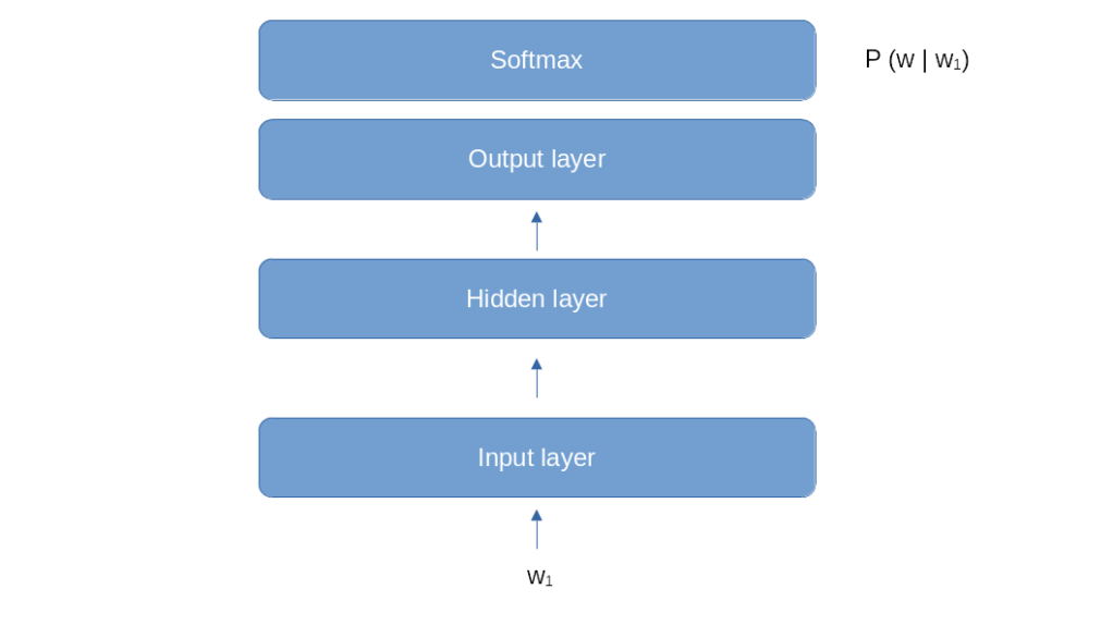 This model looks like a good fit for the first step of the word generation. If our prompt consists of one word w1, and we need to calculate the conditional probabilities P(w | w1), we could do this by feeding w1 into the model and train it to predict the probabilities P(w | w1) in its softmax layer, very much like a classical classification problem. However, things become more difficult if we have already generated two words and therefore need to calculate a conditional probability P(w | w1, w2) that depends on the two previous words. We could of course simply ignore w1 and only feed w2, which amounts to approximating