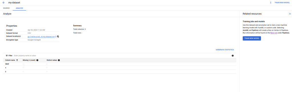 You now have several options to proceed. You can follow the link displayed on the right hand side to use Vertex AIs AutoML feature which will train a regression model on your data from scratch (be careful, there is an extra charge associated with that which goes far beyond the cost for the actual compute capacity needed, so do not do this if you just want to play). You can also analyze the data by clicking on the link “Generate statistics”.