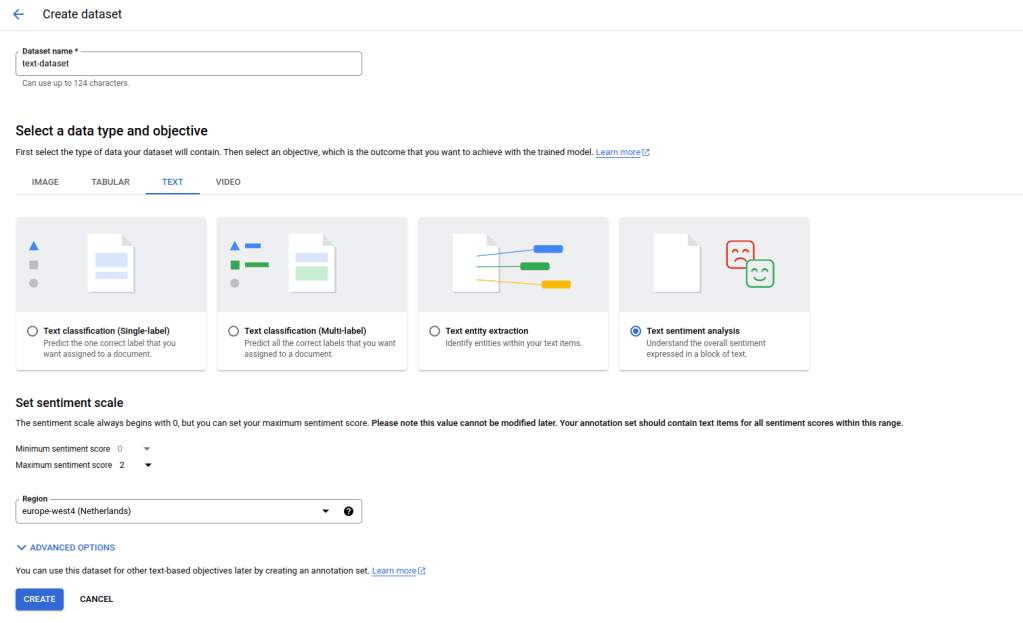 Once the upload is complete, you can create a dataset using the same workflow as for our tabular dataset, with the difference that you will have to select a text dataset with the objective sentiment analysis. Also note that you will have to specify the minimum and maximum sentiment score (0 and 2 in our case) and you will have to use a location that supports this feature which is not yet available in all locations. Let us call our dataset “text-dataset”.